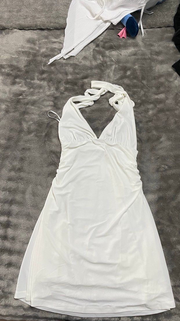Beyaz, drapeli ve V yaka uzun abiye elbise, vücuda oturan kesimiyle düğün ve şık sokak stilleri için uygundur.