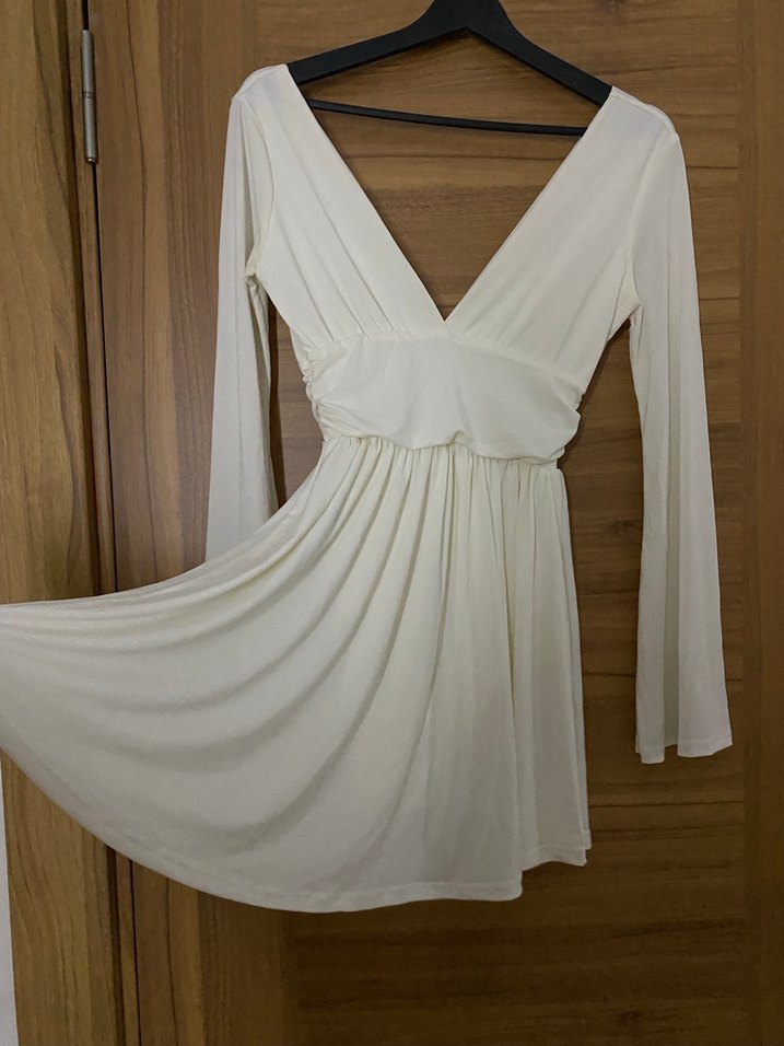 Beyaz V Yaka Drapeli Uzun Kadın Elbise