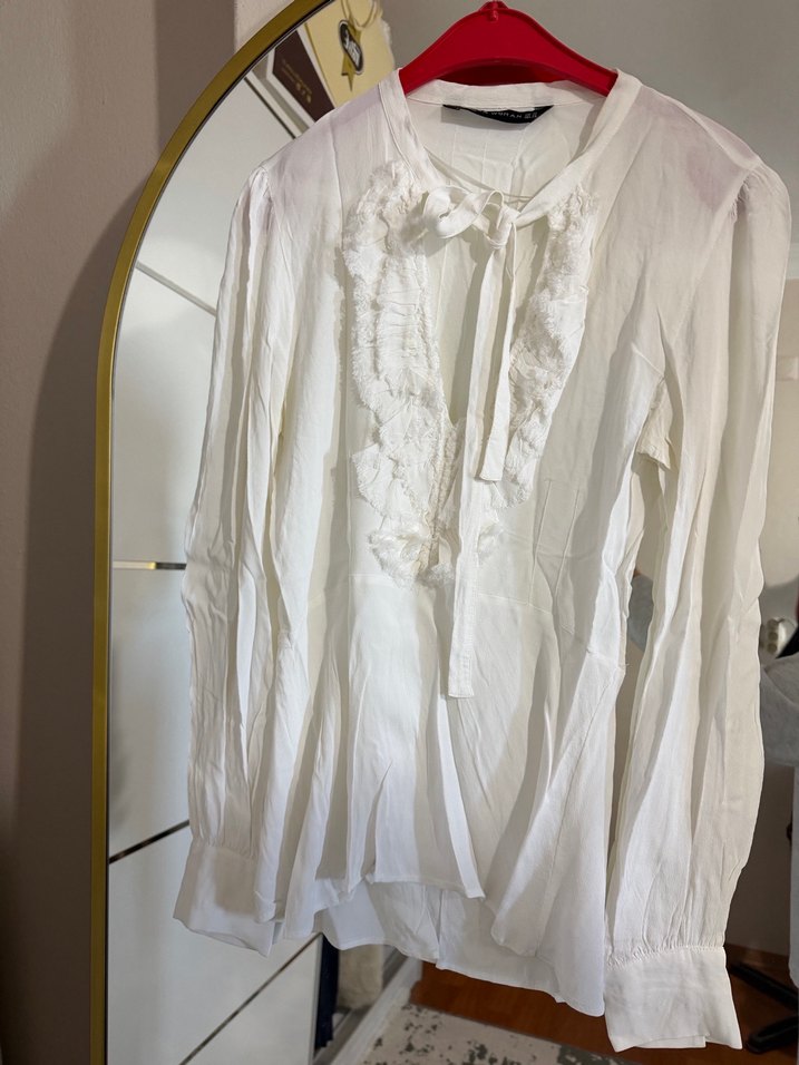 Beyaz V Yaka Fırfırlı Kadın Gömlek