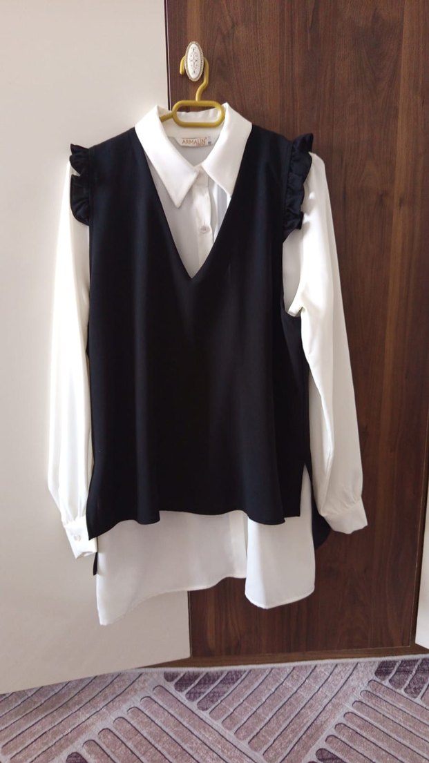 Beyaz renkte, V yaka ve fırfırlı kollara sahip kadın gömleği. Gevşek kesim, midi boy ve sentetik kumaştan üretilmiştir. Gotik Paris tarzını yansıtır, günlük kullanıma uygundur. üçlü takımdır bir defa giyildi bol geldiği için satyorum