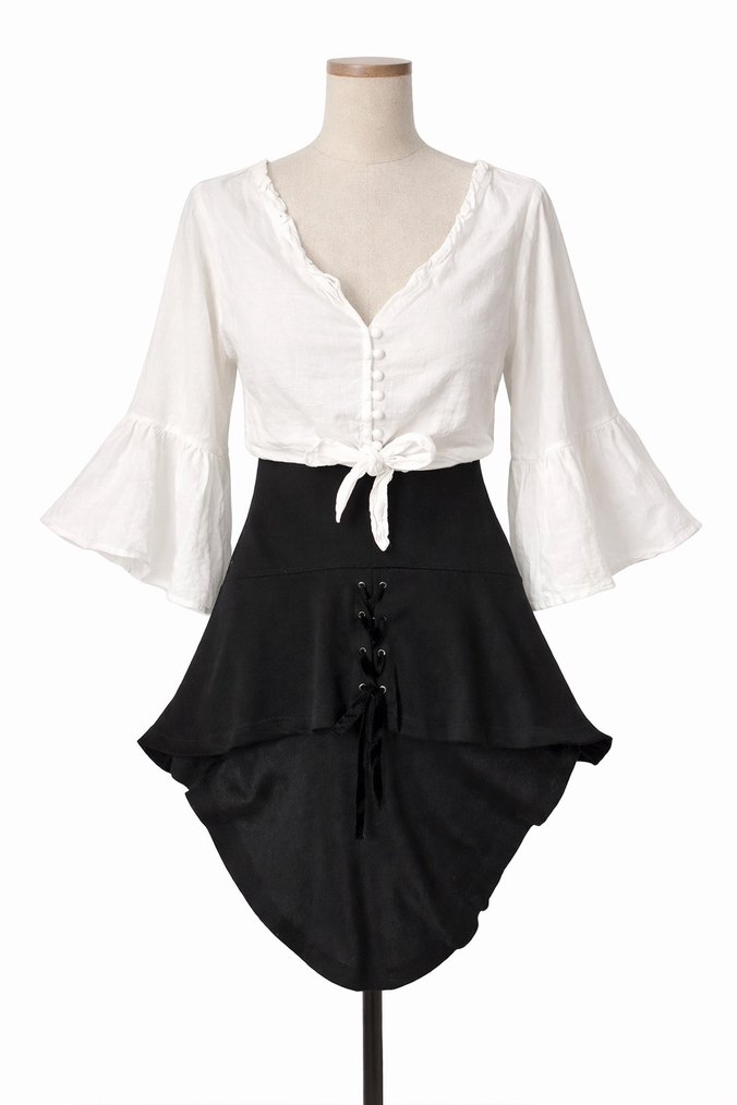 Pamuklu beyaz bluz, V yaka ve fırfır detaylıdır. Önde bağcık ve bol, askılı kolları vardır. Kısa ve mini boyda, gotik tarz için uygundur.
