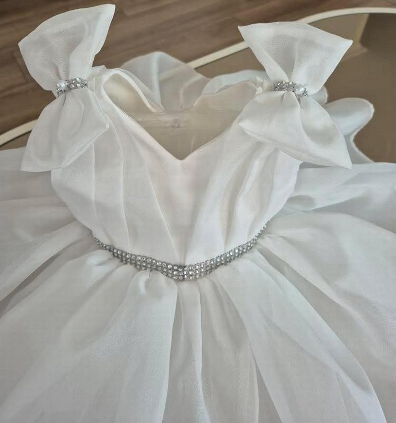Beyaz, V yakalı, fırfırlı detaylı ve askılı kollu, modern klasik tarzda, parlak kemerli, yumuşak sentetik kumaştan yapılmış dar kesim elbise. ✨ 1 yaş ama 8-9 aylık giydi 7.5 kilo 72 cm giyildi