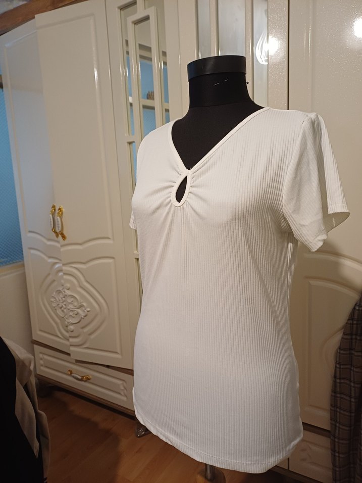 Beyaz, hafif pamuklu kumaştan, V yaka ve kısa kollu fitilli, Salaş kesimi ve yakada küçük bir açıklık detayı bulunur. Günlük kullanım için uygundur.