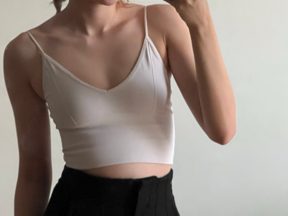 Beyaz, V yaka ve ince askılı, pamuk kumaştan yapılmış, midi boy, bol kesim kadın atlet. Minimalist ve sokak tarzına uygun, günlük kullanım için ideal. ✨