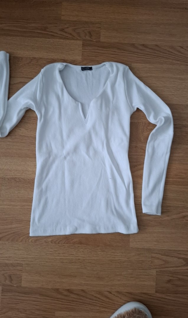 Pamuklu, uzun kollu, V yaka, beyaz renkli, sade ve ince kesim rahat kışlık kazak. Günlük sokak giyimine uygun midi boyda, şık ve sade.