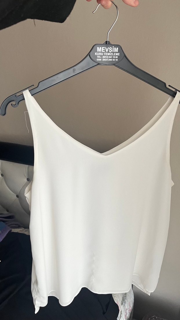 Beyaz, V yaka ve kolsuz kadın atlet. Sentetik kumaştan, bol kesim ve kısa boyda. Minimalist tasarımıyla rahat ve şık bir sokak stili sunar. ✨