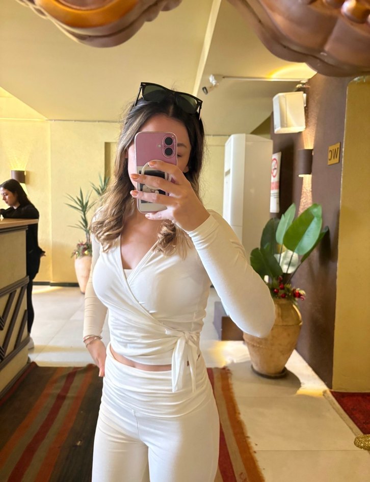 Beyaz, pamuklu kumaştan dikilmiş, v yaka ve uzun kollu, midi boy, kadın eşofman takımı. Günlük kullanıma uygun, sade ve şık görünümlü.