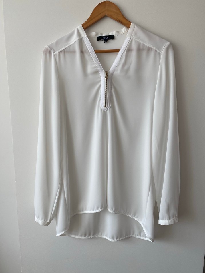 Beyaz, V yaka, uzun kollu kadın gömlek, ince ve ipeksi kumaşla tasarlanmıştır. Salaş kesimi ve minimalist tarzıyla ofis için uygundur. ✨