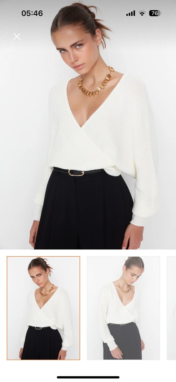 Beyaz renkli, V yakalı, uzun kollu kadın kazak. Ofis için uygun, modern ve sade tasarım. Fotoğrafta dekoltesi fazla gözüküyor fakat öyle gelmedi, ayarlanabiliyor. 1 kere giyildi o yüzden etiketi yok, geçtiğimiz aylarda aldım.