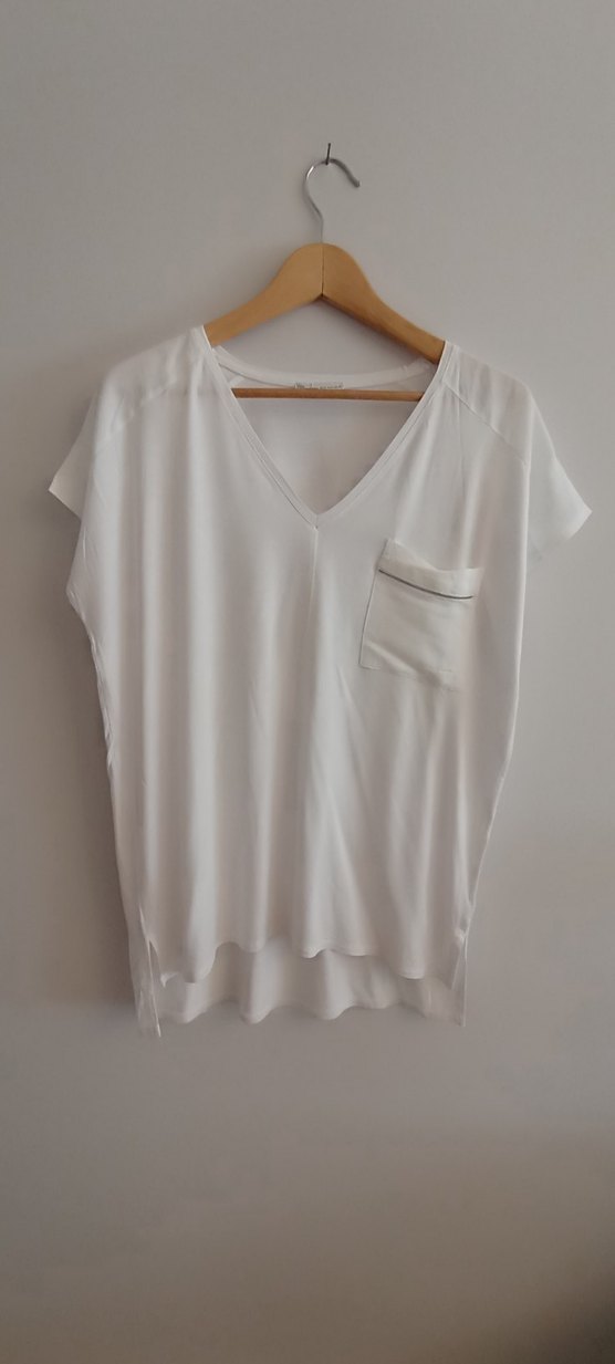 Beyaz renkte, V yakalı, kısa kollu ve bol kesim kadın tişört. İpek gibi yumuşak kumaştan, gündelik kullanıma uygun minimal ve rahat bir parça. Cep detayı bulunur. L bedenede uygundur.