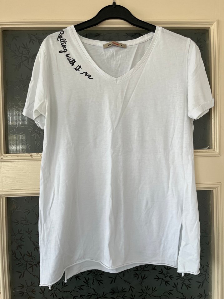 Pamuk kumaştan, kısa kollu beyaz V yaka kadın tişört. Salaş kesimi ve yakada baskılı detay ile günlük rahat sokak stili sunar. Bel kısmı yırtmaç detaylı.