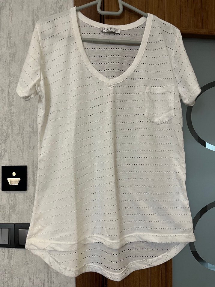 Dantel detaylı, kısa kollu, V yaka, bol kesim beyaz pamuk tişört. Küçük göğüs cebine sahiptir, günlük rahat stil için uygundur.