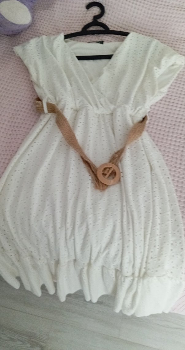 %60 cotton %40 polyester kumaştan yapılmış beyaz midi elbise, V yaka ve kısa kollara sahiptir. esnek astarlıdır. Bol kesimi ve kemerli bel detayıyla bohem tarzını yansıtır.