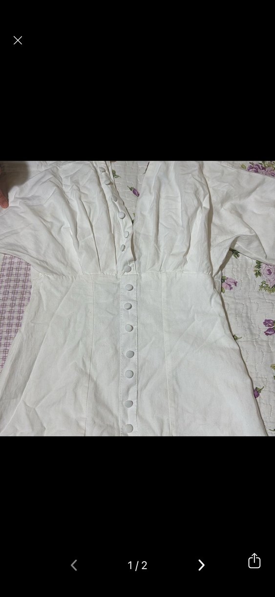 Düğmeli, V yakalı, kısa kollu beyaz keten gömlek. Fitted kesim ve midi boyda, vintage bohem tarzda. bir iki defa giyildi diz ustunde bitiyor