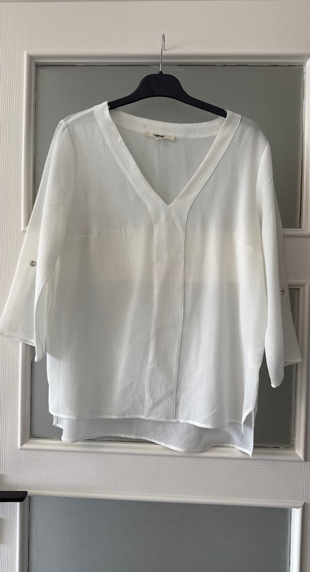 V yaka, kısa kollu, düğmeli beyaz keten gömlek. Rahat kesimi ve minimal deseniyle günlük kullanıma uygundur.
