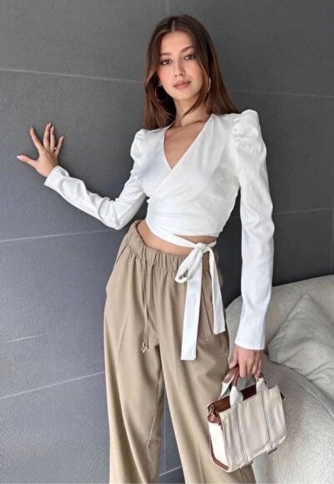 Beyaz keten bluz, V yakalı ve uzun kollu, bol ve kısa kesim. Belden bağlamalı, zahmetsiz şıklık sunar. Günlük sokak tarzı için uygundur.