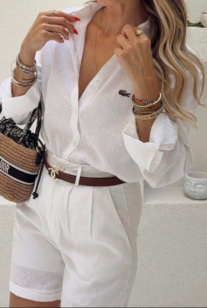 V yaka ve askılı kollara sahip beyaz keten, salaş kesim mini elbise. Bel detaylı, günlük kullanıma uygun şık bir parça.