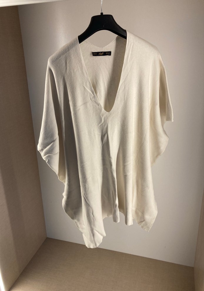Beyaz keten kumaştan, V yakalı, salaş kesimli, kısa kollu ve midi boyda kadın panço. Günlük sokak stili için uygundur.