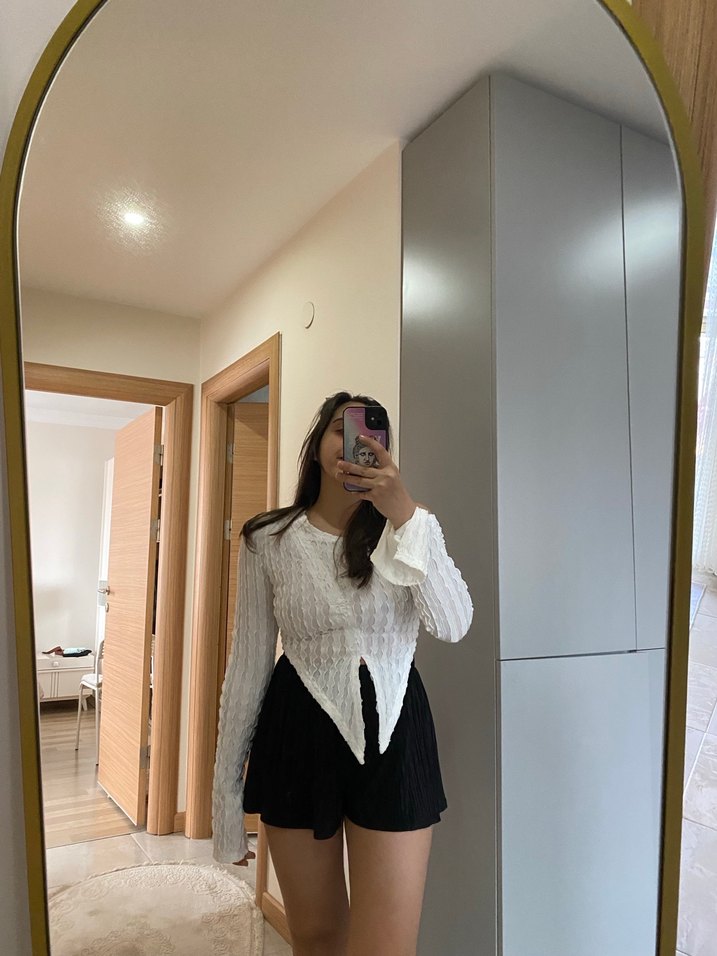 Beyaz kumaştan, V yakalı ve uzun kollu, bol kesim kısa bluzGünlük kullanım için rahat ve şık bir parça.