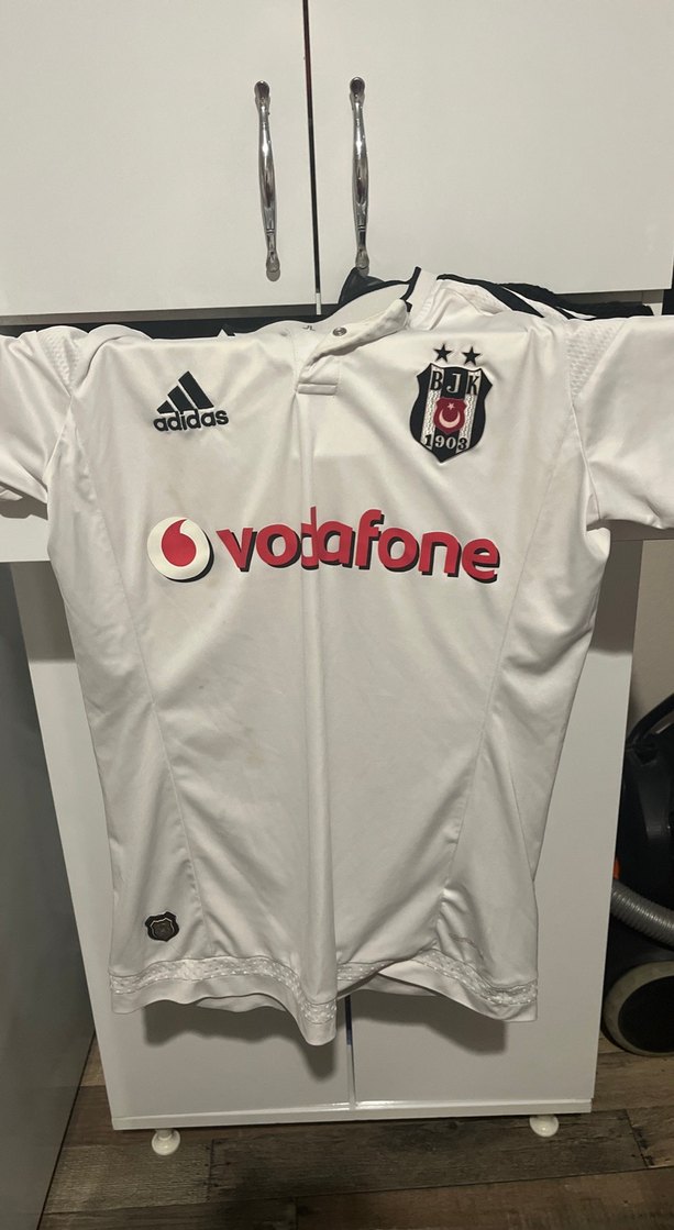 Beyaz, v yaka, kısa kollu, düğmeli, sentetik kumaştan yapılmış, Beşiktaş armalı ve Vodafone logolu, spor ve sokak giyim tarzında dar kesim forma. ⚽