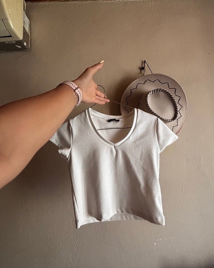 Yumuşak pamuktan, beyaz, V yaka ve kısa kollu, hafif ve şık crop top. Minimalist sokak stili için uygun.