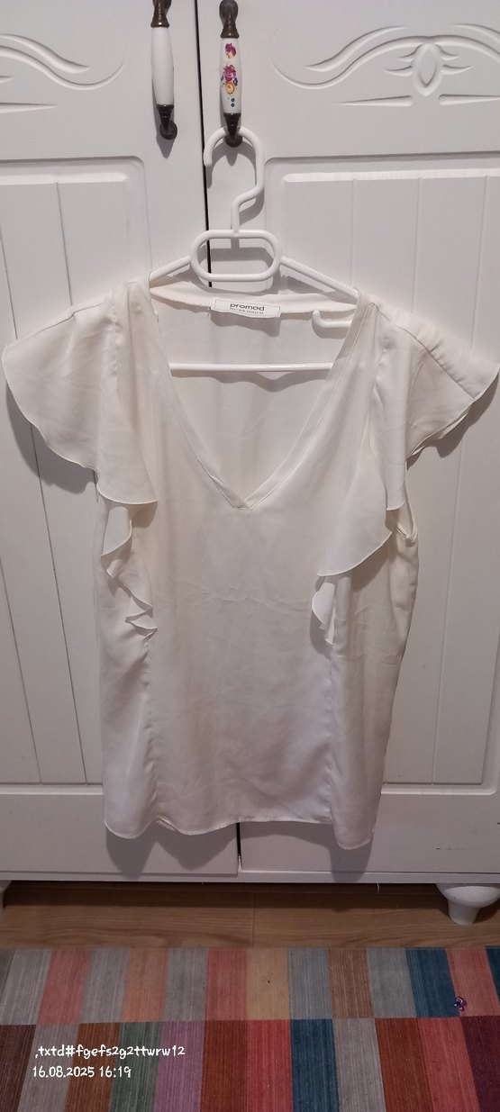 Beyaz, kısa kollu, V yaka ve fırfır detaylı kadın bluz. Yumuşak ifon kumaştan, bol kesim ve midi boyda, günlük kullanıma uygun.