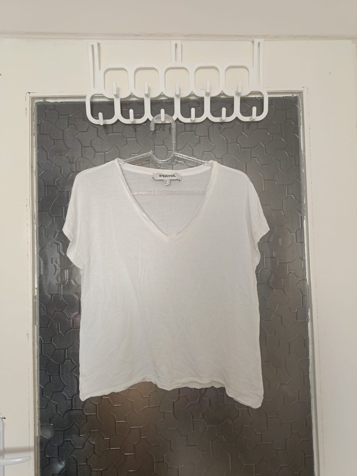 Beyaz pamuklu tişört, V yaka ve kısa kollu, bol kesimdir. Desensiz tasarımıyla günlük kullanıma uygundur ve sade şıklık sunar.