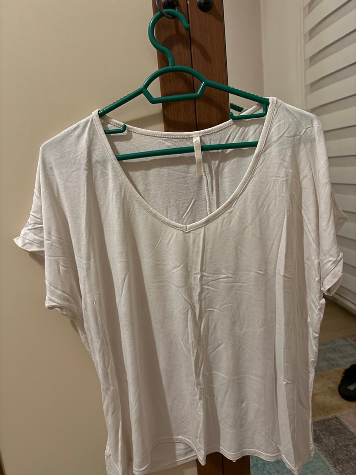 Beyaz V yaka, kısa kollu, bol kesim kadın tişörtü. Hafif keten kumaştan, minimal ve zahmetsiz şıklık sunar. Günlük rahat kullanıma uygundur. ✨