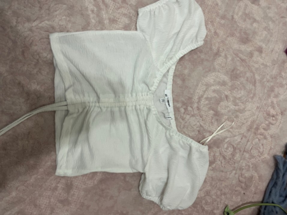 Dar kesim beyaz keten bluz, V yaka ve kısa kollu. Fermuarlı ve kısa mini boyda, dokulu desensiz kumaştan, rahat sokak stili için uygun.