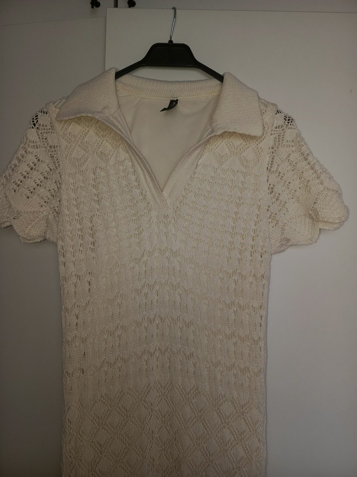 Beyaz renkte, kısa kollu ve V yakalı triko elbise, vintage bohem tarzıyla günlük kullanıma uygundur.astari mevcut hiç giymedim