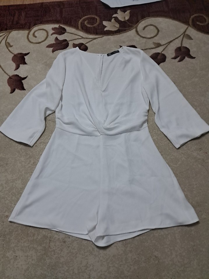 Beyaz keten kumaştan, bol kesim, V yaka ve drapeli kısa tulum. Kısa kollu ve mini boy, günlük sokak stili için uygundur. ölçüleri görselinde mevcuttur
