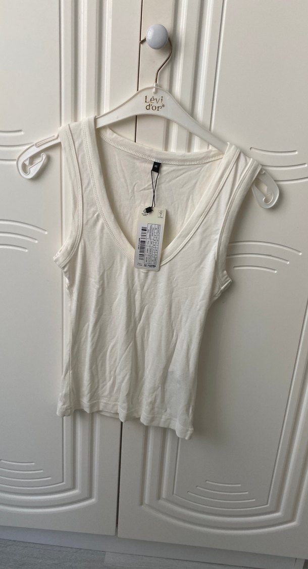 Yumuşak keten kumaştan beyaz, V yaka ve kolsuz, trend sokak stili uyumlu, günlük kullanıma uygun, Levi d'or markalı şık kadın atlet.