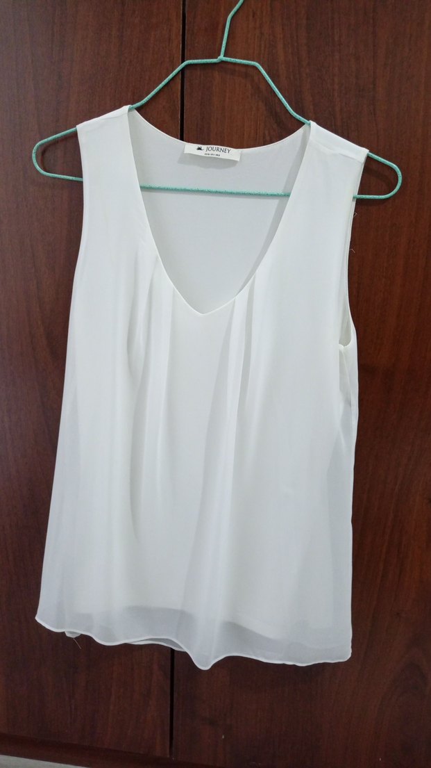Beyaz, V yakalı, kolsuz, midi boy, dökümlü ve bol kesim, ipeksi kumaştan yapılmış bluz. Minimalist ve desensiz, günlük kullanım için uygundur. 38 40 beden de rahatlıkla giyer esnek olduğu için