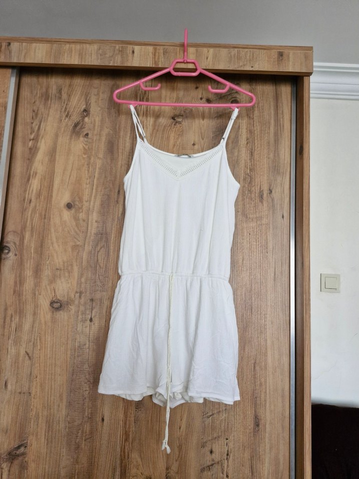 Beyaz, kolsuz mini tulum, V yaka ve bol kesim ile pamuk dokusundan bohem tarz sunar. Belde bağcık detayı vardır. ✨