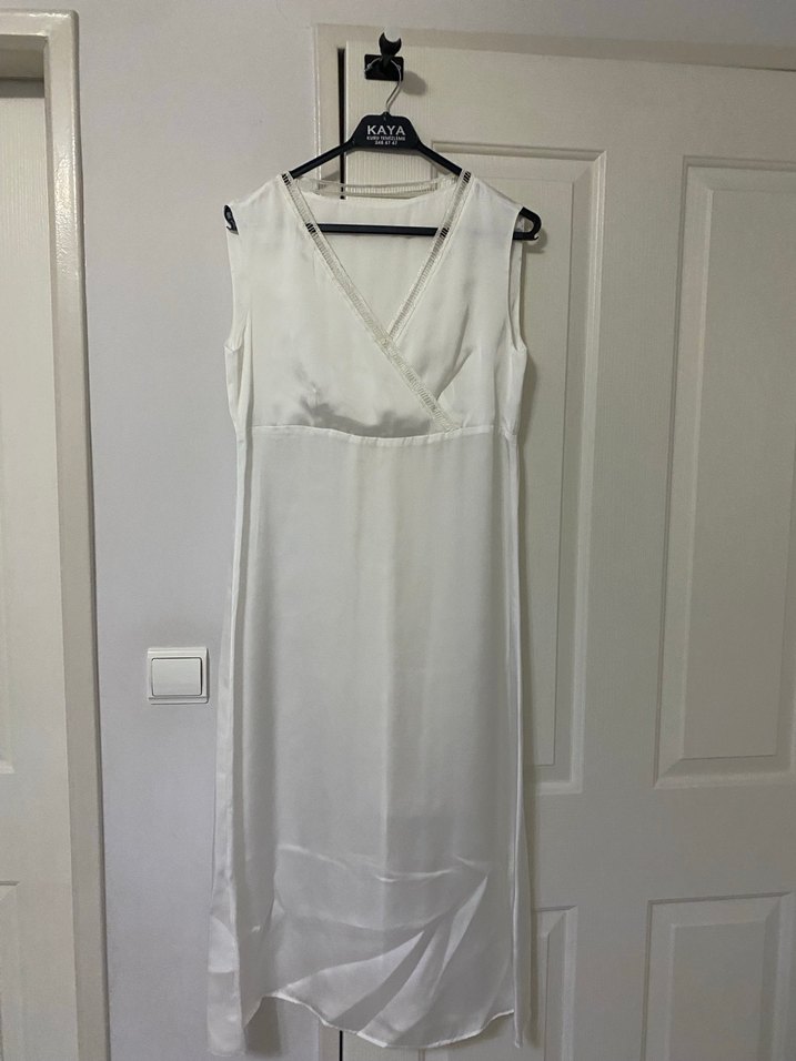 Beyaz, kolsuz, V yakalı uzun elbise, satenimsi dokuda, drapeli tasarıma sahiptir. Günlük kullanıma uygun, minimalist ve rahat kesimdir.