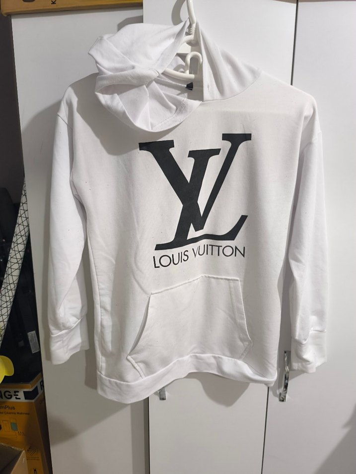 Beyaz V yaka Louis Vuitton sweatshirt, pamuklu ve parlak yüzeyli. Uzun kollu, bol kesim, baskılı logo, ön cep detaylı. Trendy rahat kullanıma uygun.