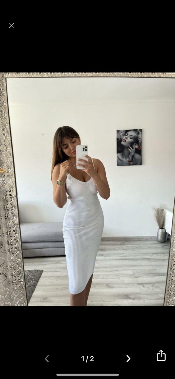 V yaka ve askılı kolları olan beyaz, vücuda oturan midi kalem elbise. İpeksi kumaştan, zahmetsiz şıklık sunar. Günlük kullanım için uygundur. çok tatli