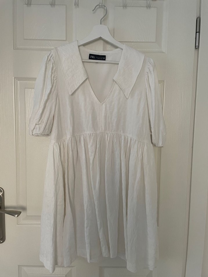 Beyaz keten midi elbise, V yaka, kısa kollu, bol kesim ve pile detaylıdır. Yumuşak ve nefes alan kumaş, bohem Paris tarzını yansıtır. Günlük kullanım için uygundur.