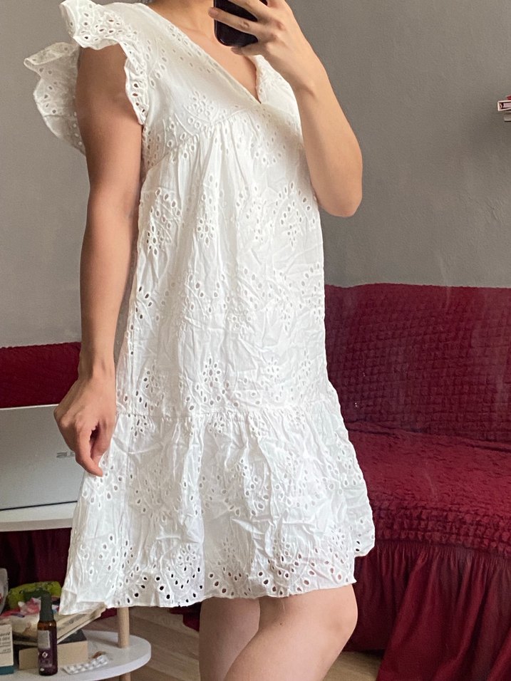 V yakalı, kısa kollu, bol kesim beyaz midi elbise. Pamuklu kumaş üzerine nakış ve dantel detaylarıyla bohem tarzda.