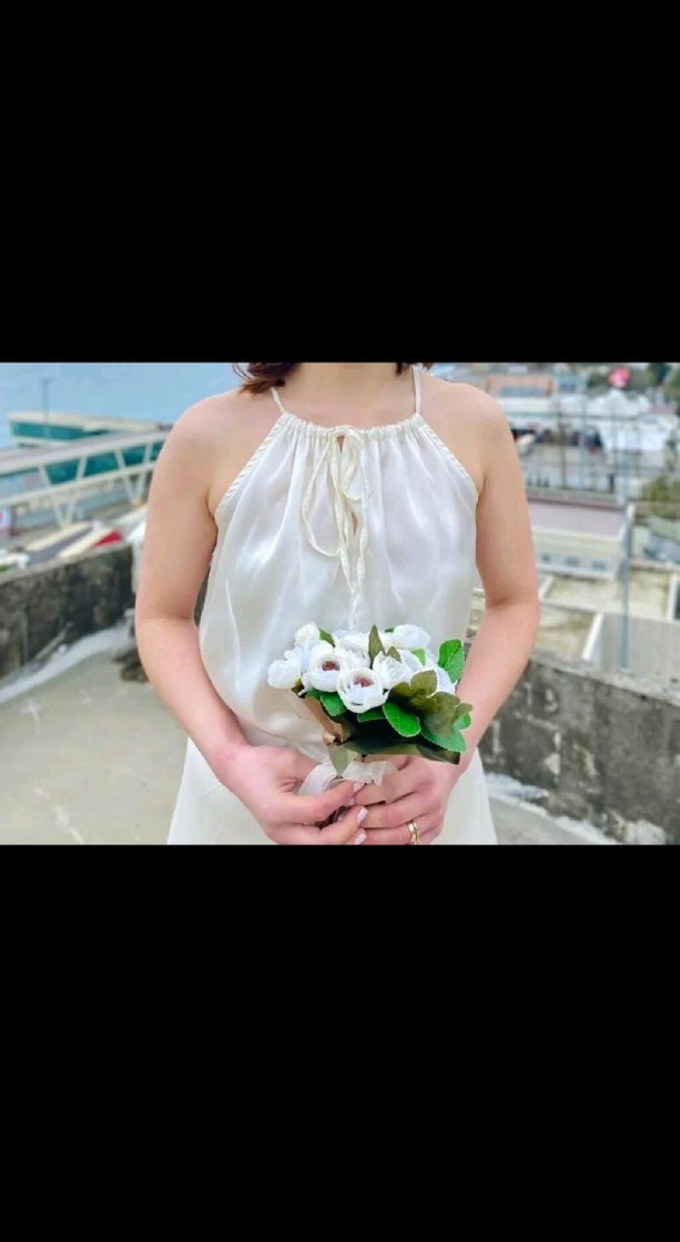 Kolsuz beyaz, parlak dokulu nikah elbisesi.Yalnız bir defa giyildi.