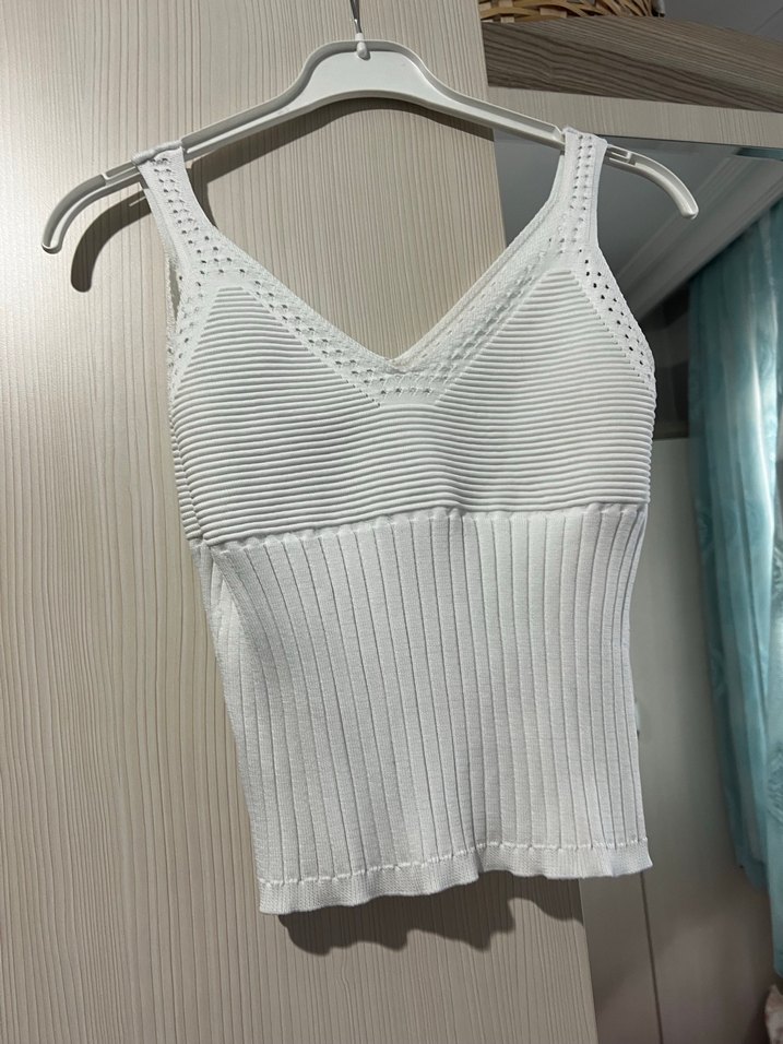 Beyaz, v yaka, kolsuz, fitted kesim örgü mini atlet. Alt kısmı fitilli dokuda, günlük sokak stili için uygun. Standart beden