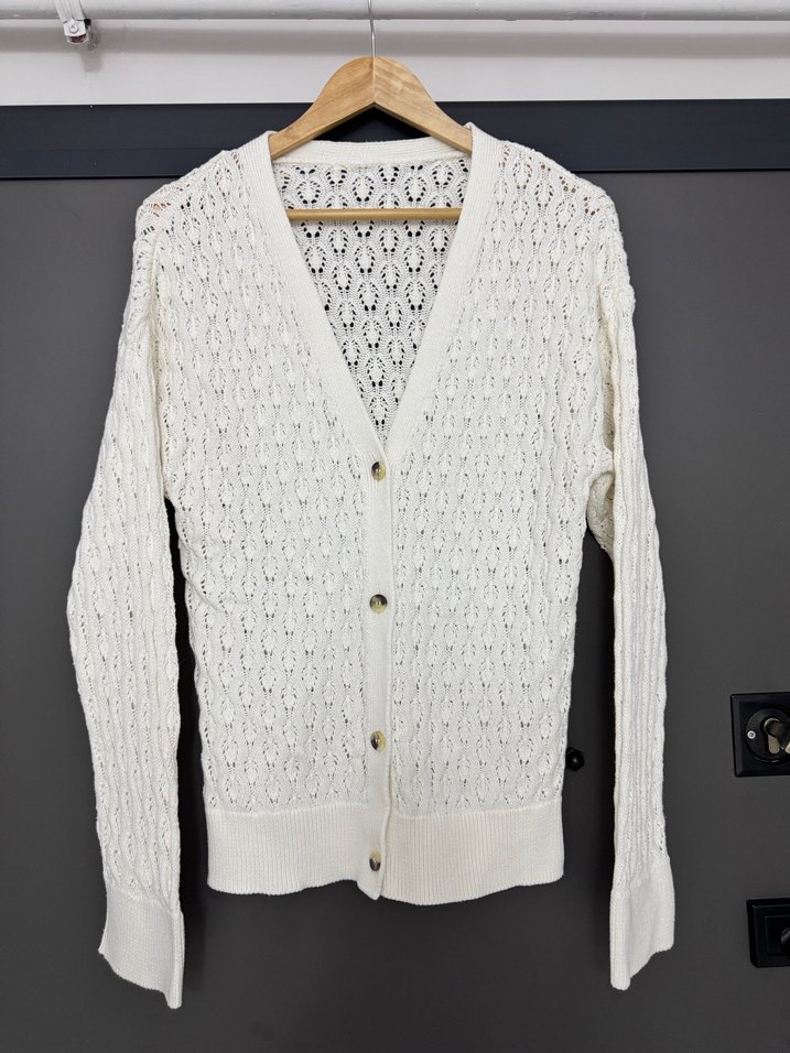 Beyaz renkli, V yaka ve uzun kollu örgü kadın hırka. Rahat kesimi ve desensiz yapısıyla günlük ve bohem tarzlara uygundur.