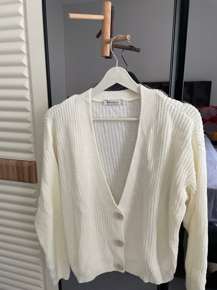 Beyaz örgü kadın hırka, V yaka ve uzun kolludur. Rahat kesim ve midi boyda olup gündelik kullanıma uygundur. Desensiz sade tasarıma sahiptir.