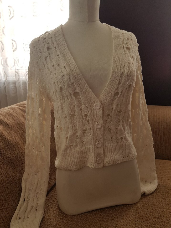 Beyaz renkli, V yaka ve uzun kollu örgü kadın hırka. Düğmeli ve bol kesim, günlük kullanım için rahat ve sade dokulu.