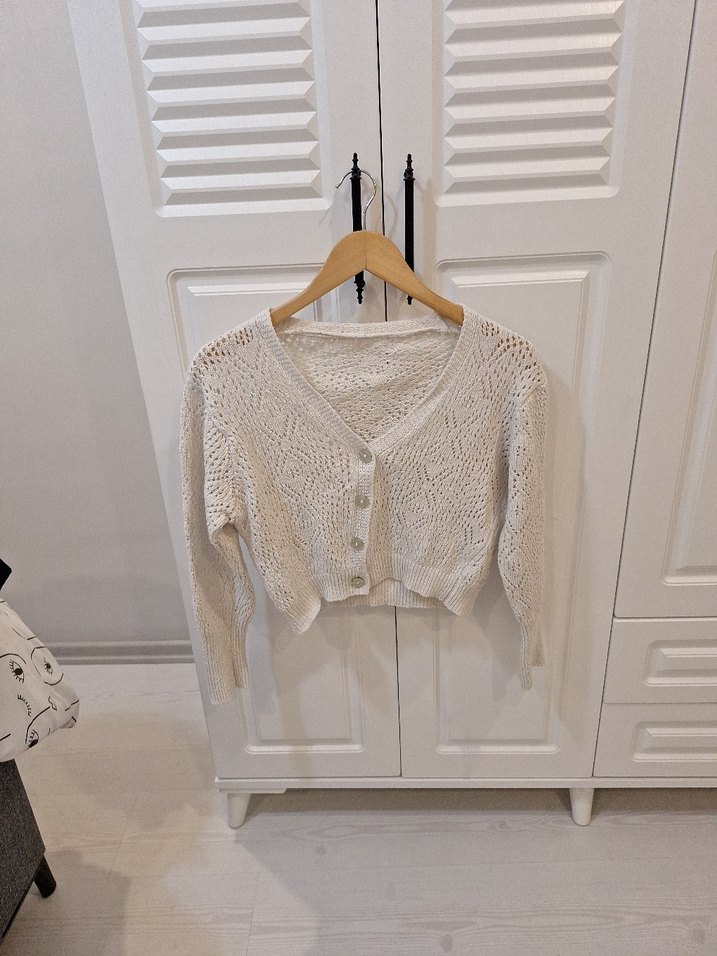 Beyaz renkli, V yaka uzun kollu, bol kesim ve midi boy örgü kadın hırka. Bohem tarzına uygun, rahat ve hafif dokusu ile günlük kullanıma uygundur.