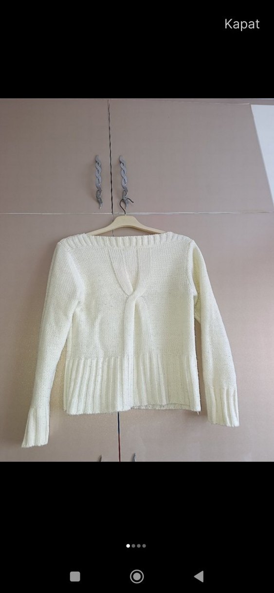 Beyaz renkte, V yakalı ve uzun kollu kısa kesim, bol fit örgü kadın kazak. Düz ve desensiz yapısıyla günlük kullanıma uygun, rahat bir bohem tarz sunar.