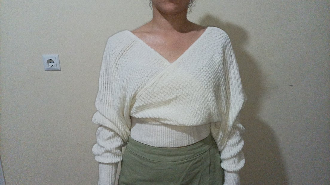 Beyaz V Yaka Örgü Kadın Kazak