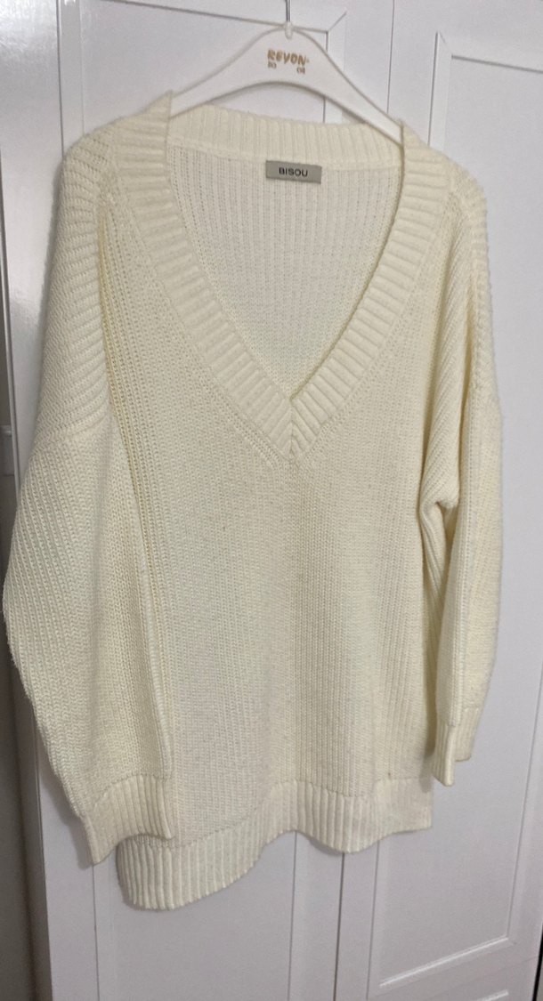 Beyaz renkli, V yaka ve uzun kollu örgü kadın kazak. Rahat kesimi ve midi boyu ile gündelik kullanıma uygundur. Desensiz, normcore tarzda bir modeldir Boy 78cm En 59cm