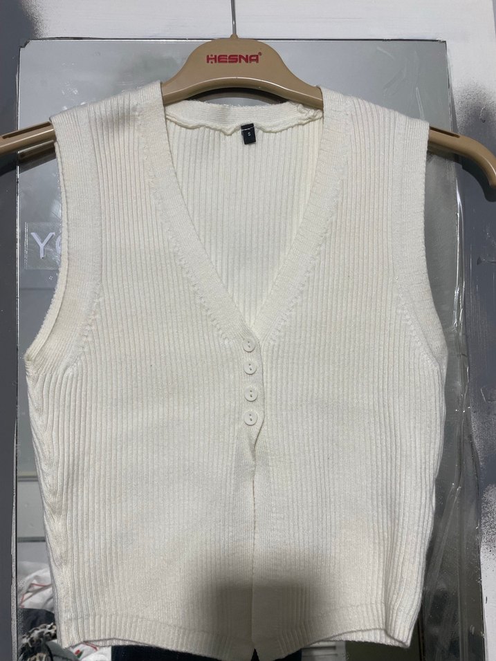Beyaz, V yaka, kolsuz, kısa boy ve vücuda oturan örgü kadın süveter. Yumuşak sentetik kumaştan üretilmiş, önünde küçük düğmeler bulunur. Günlük sokak stiline uygundur.