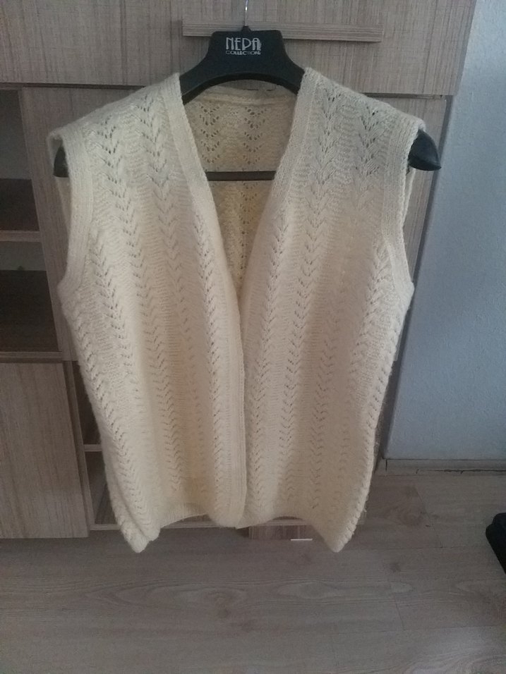 Beyaz, V yakalı ve bol kesim kolsuz örgü yelek. Kısa boyda, rahat ve bohem tarzda tasarlanmıştır. Günlük kullanıma uygundur. hiç kullanilmadi düğmesiz el örgüsüdür. geniş kesimdir